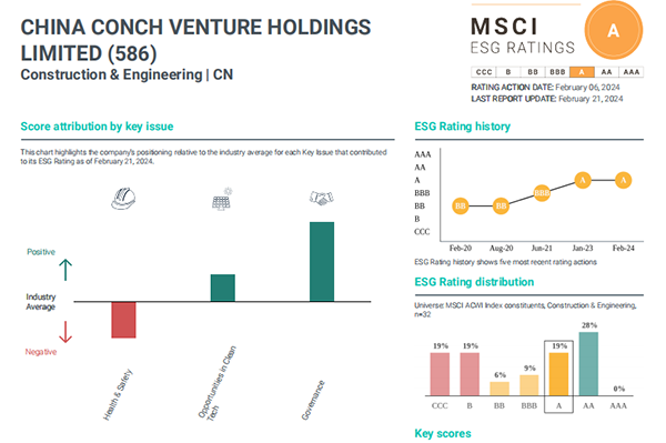 2024年2月21日,國際知名指數(shù)機(jī)構(gòu)明晟(MSCI)公布最新年度環(huán)境、社會及管治(簡稱"ESG")評級結(jié)果。海螺創(chuàng)業(yè)憑借在ESG方面的優(yōu)異管理表現(xiàn),連續(xù)第二年獲得A級評級,持續(xù)為全球各大投資機(jī)構(gòu)決策提供重要依據(jù)。同時,海螺創(chuàng)業(yè)連續(xù)兩年保持MSCI“建筑及工程”類別國內(nèi)首位,進(jìn)一步彰顯了公司的投資價值屬性,擴(kuò)大了公司在全球資本市場中的投資引力和范圍。