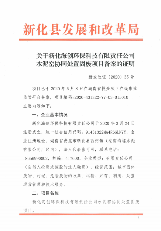 新化海創水泥窯協同處置固廢項目是新化縣2019年重點招商引資項目,項目于2019年12月23日簽署合作協議,計劃投資2.2億元,擬建設150t/d飛灰水洗水處理處置生產線和200t/d污泥處置系統,年可處置飛灰4.95萬噸、污泥等一般固廢6.6萬噸。2020年3月24日公司注冊成立。自新化海創成立以來,在地方政府及母公司的大力支持和高度重視下,克服疫情影響、戰勝重重阻力,科學統籌、精準施策,加大對外協調力度,于5月9日取得核準備案批復,5月22日取得新化縣政府《關于同意項目開工建設的函》。項目從簽約到建設,僅歷時半年,建成后將與祁陽、臨湘、益陽等項目發揮協同效應。下一步,新化海創將盡快完成項目環評工作,穩步推進權證辦理,盡早啟動工程建設,以只爭朝夕、奮發有為的姿態,確保實現項目早竣工、早投產、早受益,助力地方政府打造"無廢城市",推動縣域經濟綠色生態高質量發展和人居環境的改善作出貢獻,為海螺創業的發展壯大添磚加瓦。