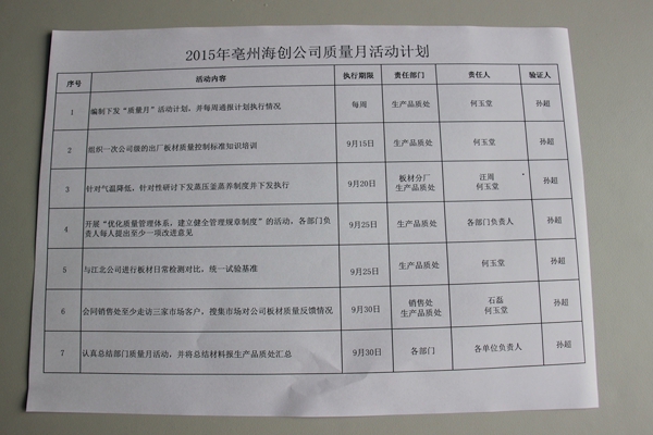 ? ? 月初,由公司領導組織相關部門研討,編制下發(fā)了2015年質(zhì)量月活動計劃。按照活動計劃的安排,公司于9月上旬對出廠板材質(zhì)量控制標準組織了研討修訂,并組織銷售人員學習,提高了市場銷售人員對公司板材質(zhì)量及性能認知水平。