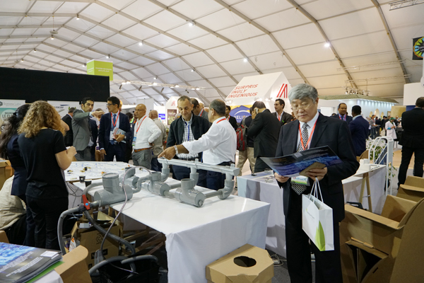 ??? 11月8日上午,在摩中商會、摩洛哥外貿銀行、香港匯盛資本等機構負責人的陪同下,紀勤應總經理一行參觀了聯合氣候大會主展館。展會現場來自世界各地節能環保產業技術展示、部分獨具匠心的展臺設計展現出的世界各國實現綠色循環低碳發展,推進清潔能源、可再生資源,應對氣候變化、追求美好未來的決心等給考察團一行留下了深刻的印象。