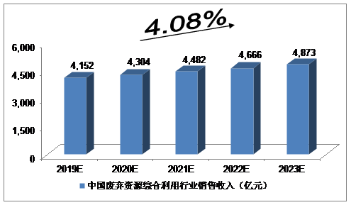 ? ? 我們預計,2019年我國廢棄資源綜合利用行業銷售收入將達到4,152億元,未來五年(2019-2023)年均復合增長率約為4.08%,2023年將達到4,873億元。
