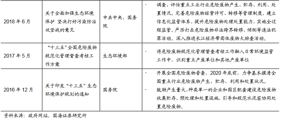 “十三五”以來(lái),從中央到各部委,已出臺(tái)多項(xiàng)關(guān)于危廢排查與清單管理、危廢處理處置設(shè)施管理、問(wèn)責(zé)機(jī)制等體系化政策,此外,環(huán)保督察不斷推進(jìn),逐步由中央下沉至地方,政策層面對(duì)危廢量的提升作用明顯。