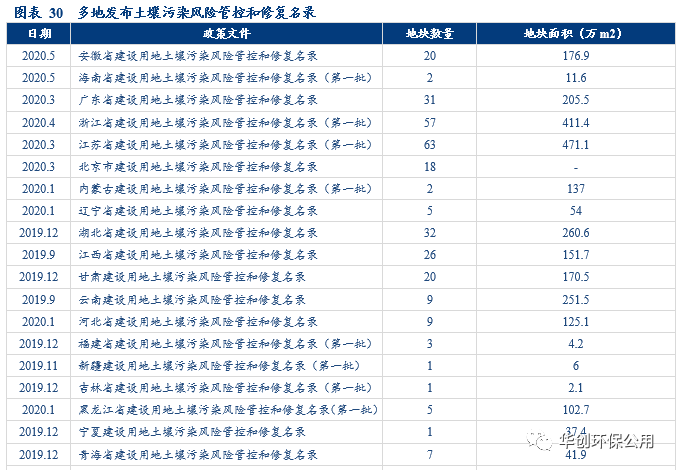 而自2019年年底起,各地方政府的配套政策密集且高效落地,有望成為各地大力啟動修復工程的信號。截止2019年底,華北地區、西北和經濟發達地區均在土壤政策方面大力推進。2020年,山東、廣東、四川等部分省市發布具體土壤防治方案;而在操作層面上云南、上海、廣東等地已經出臺明確的修復流程操作要求。此外,截止2020年5月,全國所有省級行政區已出臺土壤污染風險管控和修復名錄,累計需修復地塊554個,面積約5000萬m2。土壤修復名錄的出臺一方面意味著多省的土壤詳查已經轉移至工業場地領域,另一方面隨著土壤詳查的基本完成,行業進入修復周期,需求有望持續高增。