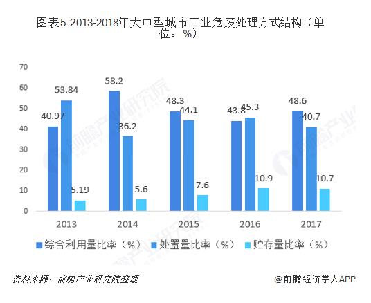 ? ? 從處理方式來看,綜合利用逐漸成為大中型工業(yè)危廢的主要處理方式,工業(yè)危廢綜合利用量比例由2013年的40.97%上升至2017年的48.6%;處置量比例由2013年的53.84%下降至2017年的40.7%。