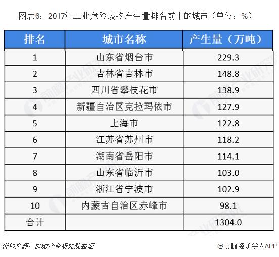 ? ? 從地區(qū)上來看,2017年工業(yè)危廢排名前十的城市共計(jì)產(chǎn)生工業(yè)危廢1304萬噸,占全部信息發(fā)布城市產(chǎn)生總量的32.5%。排名前三的分別為山東省煙臺(tái)市、吉林省吉林市和四川省攀枝花市,產(chǎn)生量分別為229.3萬噸、148.8和138.9萬噸。與一般工業(yè)固廢不同的是,山東省工業(yè)危廢產(chǎn)生量較多,在前十城市中占據(jù)兩席;西部地區(qū)入榜反而較少,主要原因?yàn)槲鞑抗I(yè)以一般工業(yè)為主,沿海地區(qū)工業(yè)結(jié)構(gòu)偏向高端制造。