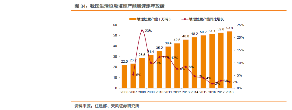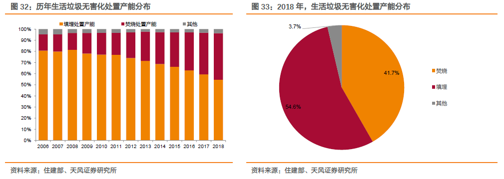 垃圾填埋是垃圾焚燒的最主要競爭工藝,近年來產能增速明顯放緩。生活垃圾無害化處置方式主要包括填埋、焚燒、堆肥等。2018年,填埋和焚燒處置產能占無害化處置產能的比例分別為54.6%、41.7%。填埋在早期因技術簡單、成本低等特點得到大規模應用,但占地面積較大,與緊缺的土地資源天然具有對抗性,近年來產能增速明顯放緩;焚燒具有占地面積小、能源利用高等特點,對垃圾填埋的替代作用逐年顯現,產能占比持續提升。