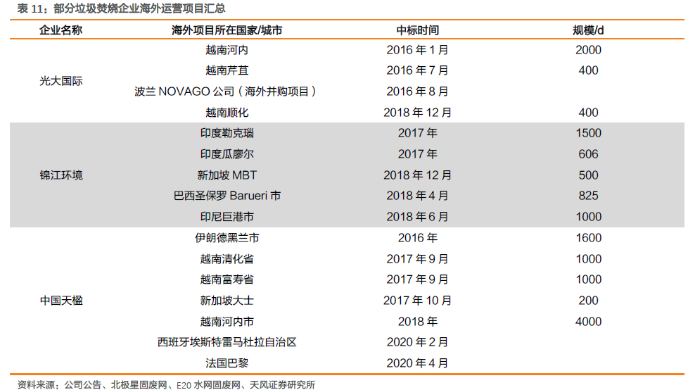 海外拓展穩步推進,龍頭企業擁有多個海外運營項目。隨著國內焚燒設備及技術的日漸成熟,國內垃圾焚燒發電企業已由早期的技術引進者轉向設備、技術輸出者,并通過海外并購等方式迅速開拓海外市場。目前已有多家企業擁有數個海外投資運營的垃圾焚燒發電項目,涵蓋東南亞、歐洲乃至美洲等多個區域。