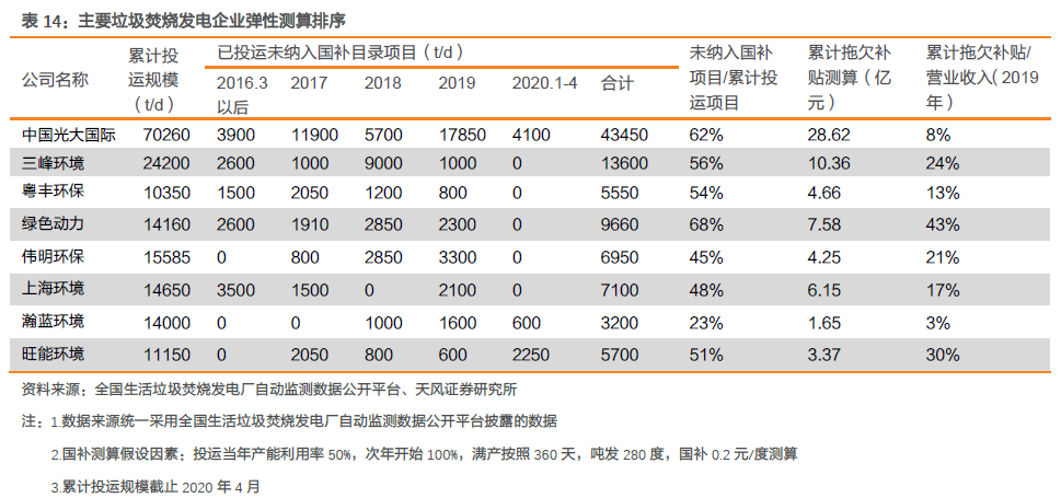 存量項目拖欠的補貼解決后,企業現金流有望得到改善。補貼發放不僅可以通過改善現金流,降低財務杠桿來減少財務費用,同時應收賬款收回,前期應收賬款計提減值沖回,也將增加公司當期業績。截止2020年4月,全國垃圾焚燒運營規模50萬噸/日,其中未納入目錄項目占比約48%,累計拖欠補貼金額約130億元。從企業具體情況來看,我們測算出2016-2020年各家企業的累計拖欠補貼,并以累計拖欠補貼金額占2019年營收的比例作為利好彈性的觀測值。若存量補貼發放,對垃圾焚燒發電企業將帶來較大的現金流改善。