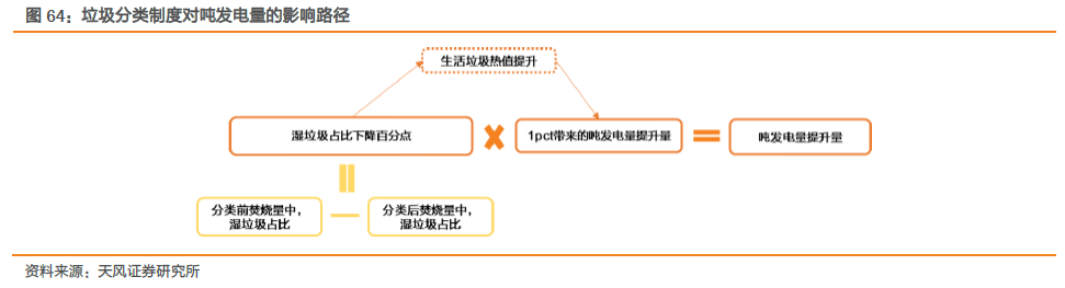 ⑤由垃圾分類導致的噸發提升量:據《深圳市生活垃圾分類對垃圾焚燒影響的研究》相關內容,我們推算出當濕垃圾在入爐垃圾中的占比降低1pct時,噸垃圾發電量可以提升2.2-3.0Kwh,保守假定濕垃圾占比下降1pct會帶來噸發電量提升2.2Kwh。