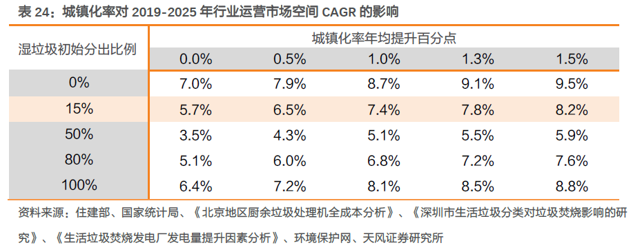 從靜態時點看,相較垃圾分類前,分類后焚燒處置量會出現一定下滑。但從長期動態視角看,目前我國經濟仍處于穩步發展過程中,城鎮化率仍在持續提升,人均垃圾產量仍處于緩慢上升通道,且焚燒占比仍有提升空間,焚燒處置量有望逐年增加,疊加垃圾分類及技術進步驅動下的噸上網電量提升,垃圾焚燒發電行業運營市場空間有望保持正增長。綜合各類影響因素,我們預計2019-2025年,垃圾焚燒發電行業運營收入CAGR約7%。