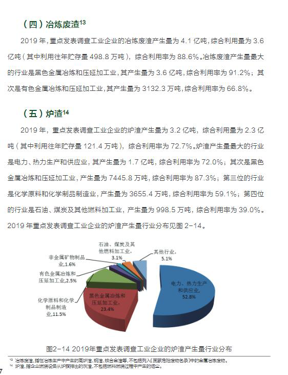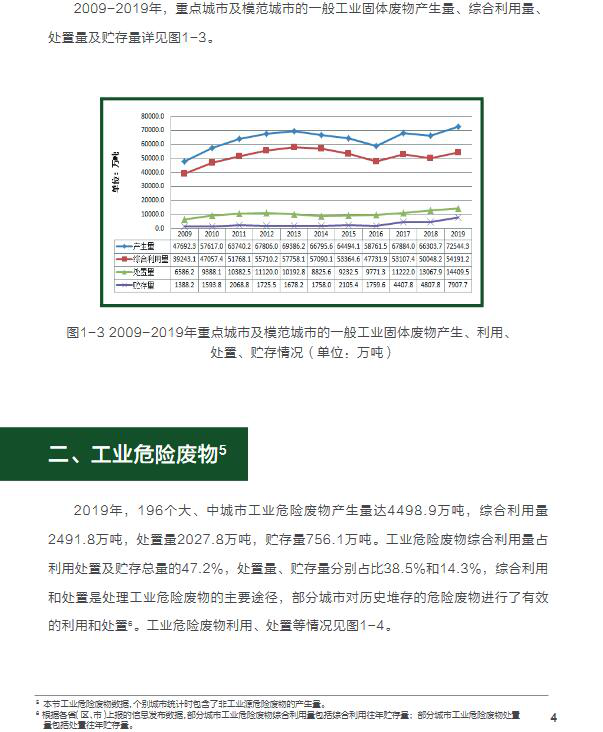 2019年,196個大、中城市一般工業(yè)固體廢物產生量達13.8億噸,綜合利用量8.5億噸,處置量3.1億噸,貯存量3.6億噸,傾倒丟棄量4.2萬噸。一般工業(yè)固體廢物綜合利用量占利用處置及貯存總量的55.9%,處置和貯存分別占比20.4%和23.6%,綜合利用仍然是處理一般工業(yè)固體廢物的主要途徑,部分城市對歷史堆存的一般工業(yè)固體廢物進行了有效的利用和處置。