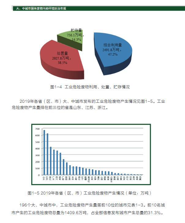 2019年,196個大、中城市工業(yè)危險廢物產生量達4498.9萬噸,綜合利用量2491.8萬噸,處置量2027.8萬噸,貯存量756.1萬噸。工業(yè)危險廢物綜合利用量占利用處置及貯存總量的47.2%,處置量、貯存量分別占比38.5%和14.3%,綜合利用和處置是處理工業(yè)危險廢物的主要途徑,部分城市對歷史堆存的危險廢物進行了有效的利用和處置。