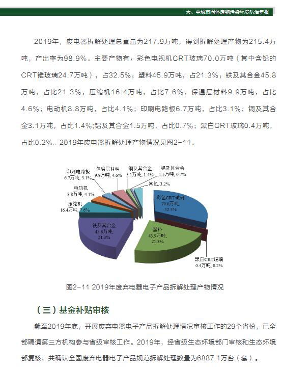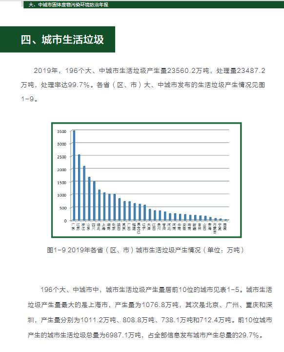 2019年,196個大、中城市生活垃圾產生量23560.2萬噸,處理量23487.2萬噸,處理率達99.7%。