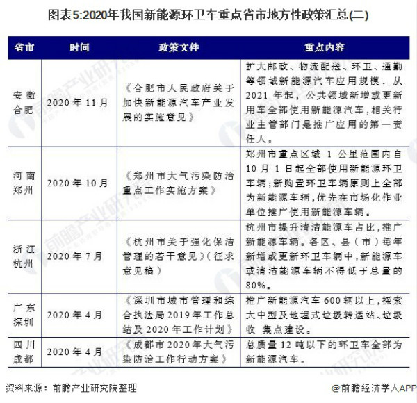 在地方層面,以省會城市為代表的大中型城市2020年密集出臺規劃政策,均對包括環衛車在內的公共領域用車新能源化提出要求,以最近的11月19日合肥發布的《加快新能源汽車產業發展的實施意見》為例,意見明確提出從2021年起,公共領域新增或更新用車全部使用新能源汽車,相關行業主管部門是推廣應用的第一責任人。