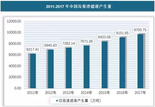 ? ? 此外,有關(guān)數(shù)據(jù)顯示,2017年我國日均垃圾滲濾液產(chǎn)生量為26.57萬噸,全年垃圾滲濾液產(chǎn)生量達(dá)到9700.75萬噸,較上年增長549.1萬噸,同比增長6%。