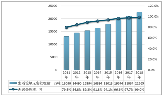 ? ? 最巨大的環(huán)保需求拉動下,國內(nèi)生活垃圾處理行業(yè)出現(xiàn)同步增長。較2011年全國79.8%的無害處理率,中國生活垃圾無害處理行業(yè)取得令人矚目的成績。2018年全國生活垃圾無害處理量達到22565萬噸,無害處理率達到99%。