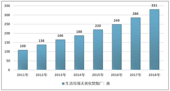 我國生活垃圾無害化焚燒處理廠家數(shù)由 2011年109家,增長至 2018 年 331 家,年均復(fù)合增長率達到 17.2%。