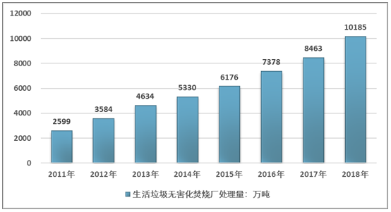 2011-2018年中國生活垃圾無害焚燒廠處理規(guī)模