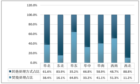 ? ? 從區(qū)域情況看,各地區(qū)焚燒處理方式利用情況差異性較大。經(jīng)濟發(fā)達地區(qū)采用焚燒處理方式比率較高,其中華東為64.8%,西南51.3%,華南41.1%,而西北、東北地區(qū)焚燒方式利用率較低。