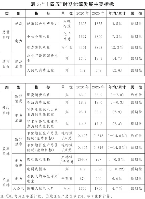 總量目標。到2025年,省內能源年綜合生產能力達到1655萬噸標準煤以上,其中:非化石能源生產能力五年累計提高44%。全社會用電量達到2300億千瓦時以上,年均增長7.2%;人均用電量達到5130千瓦時/人,五年累計提高43%。發電裝機力爭達到7800萬千瓦以上,五年累計增加79%以上。