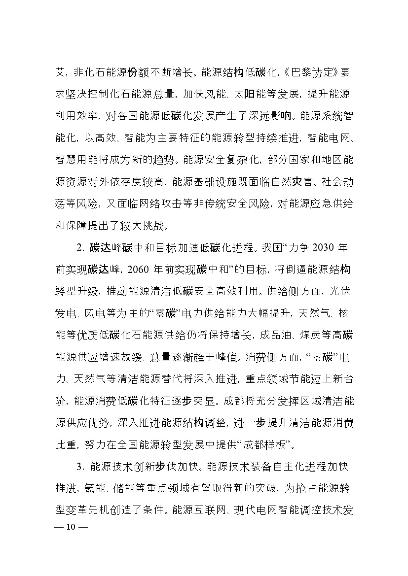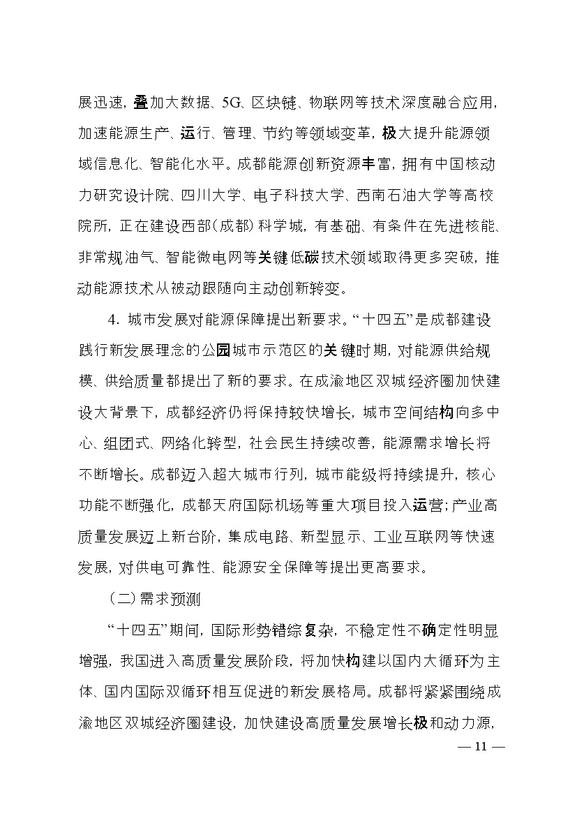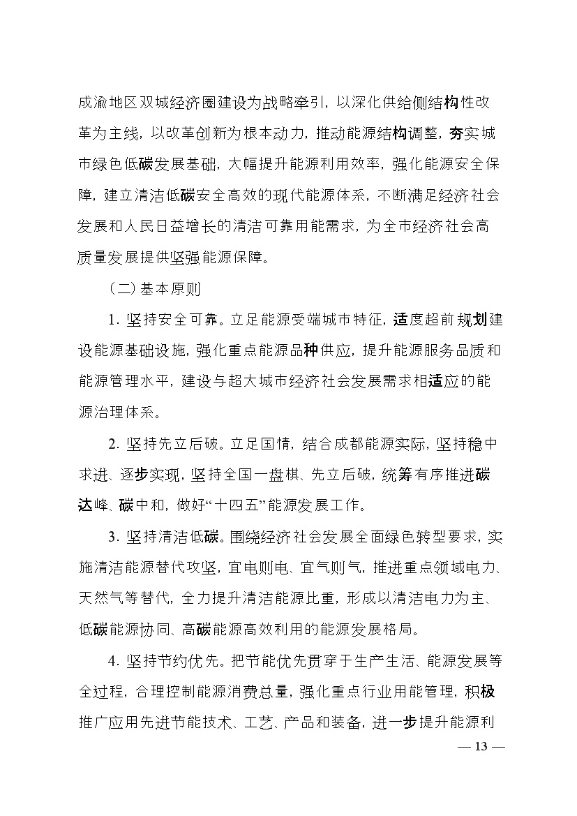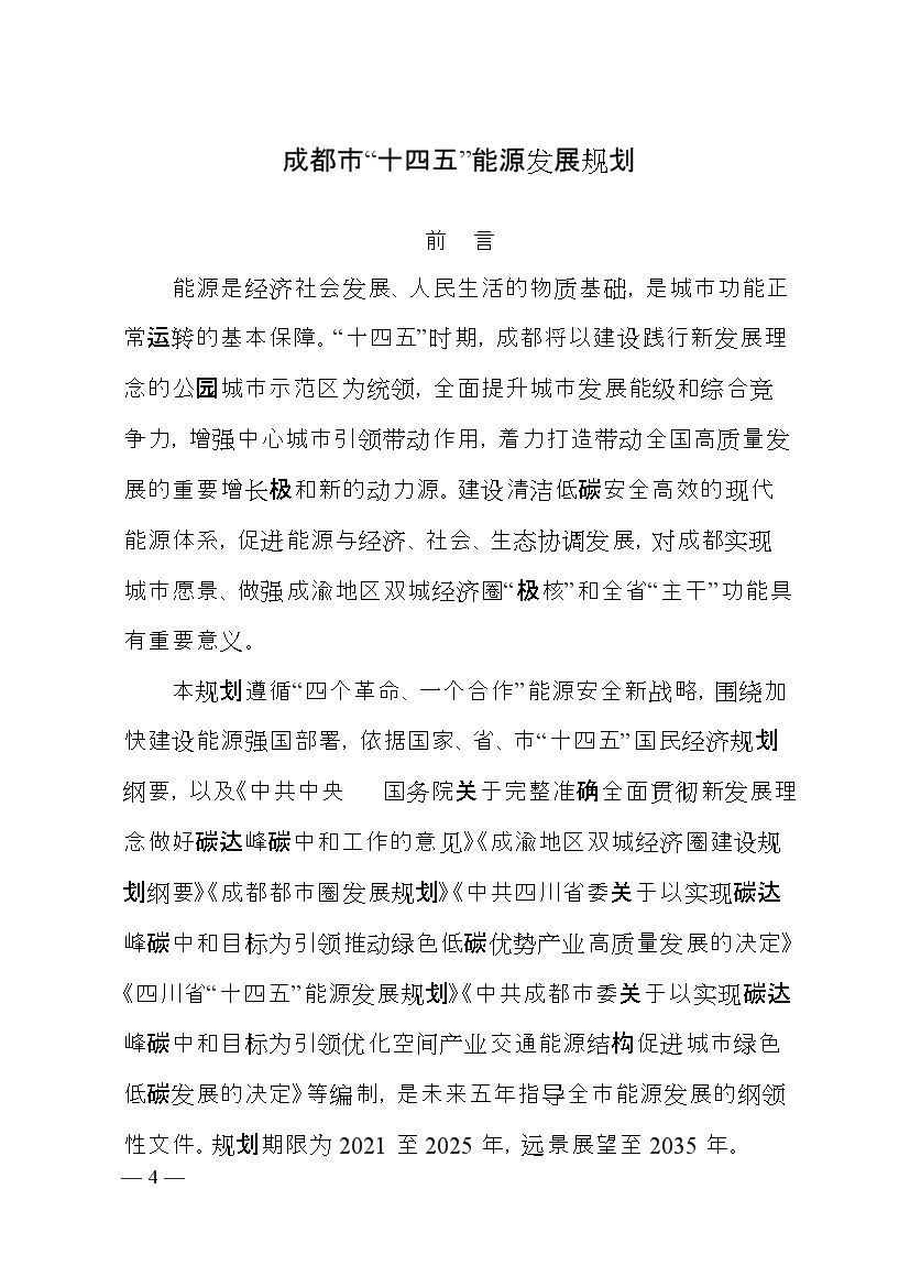 成都市人民政府印發《成都市“十四五”能源發展規劃》,明確了以創新發展為動力,以強化保障能力為抓手,加快構建新型電力系統,持續推進清潔能源替代,優化能源消費結構,全力提升能源利用效率發展思路。并提出總量控制目標、消費結構目標、能源安全保障、等能源節約目標、基礎設施建設等發展目標。