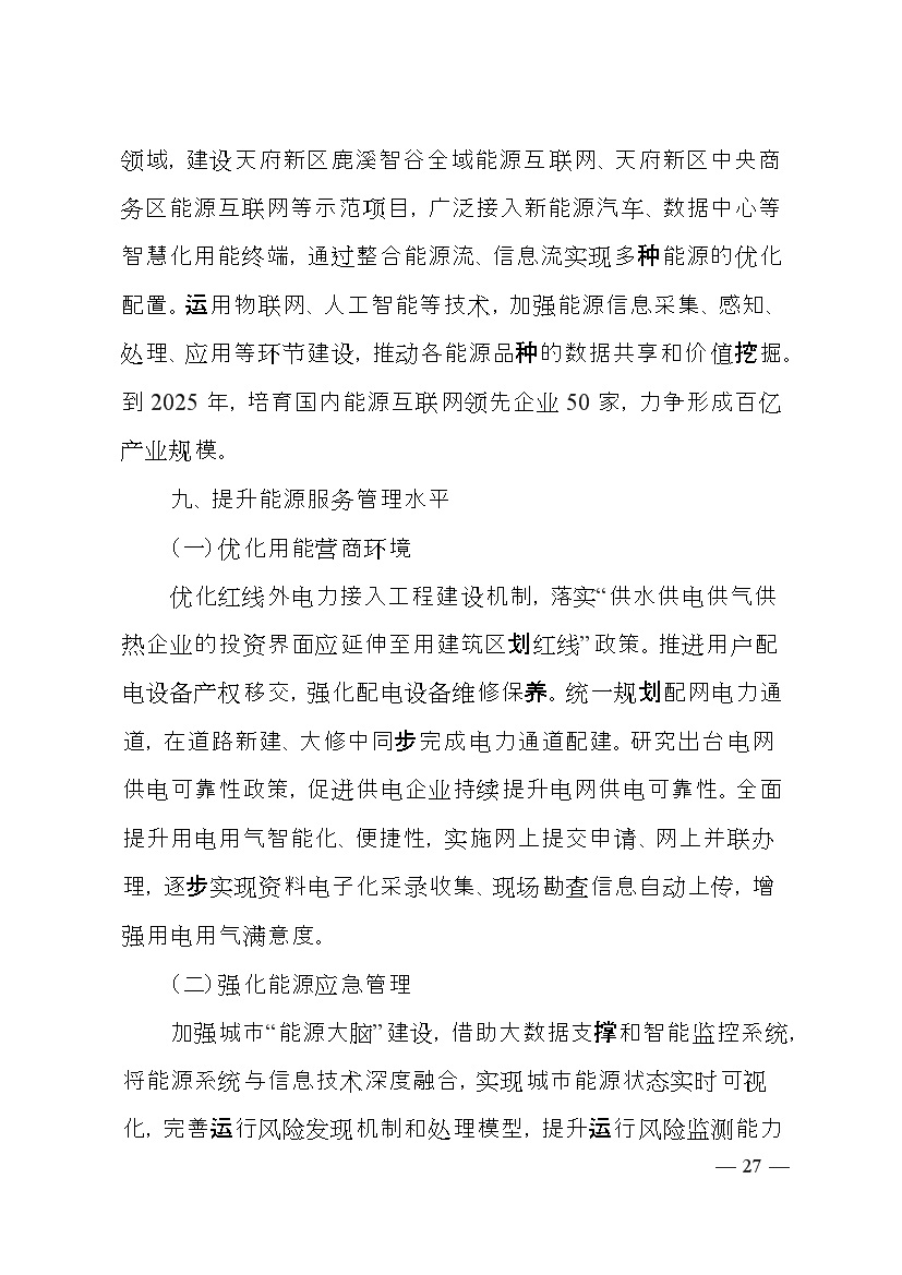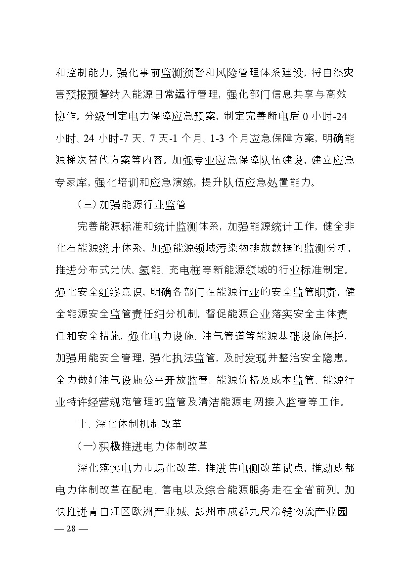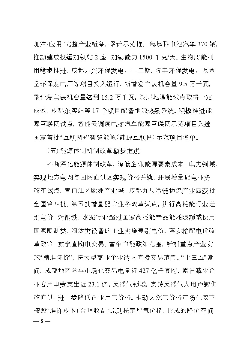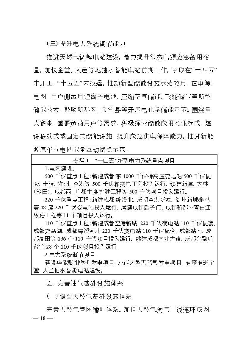 成都市人民政府印發《成都市“十四五”能源發展規劃》,明確了以創新發展為動力,以強化保障能力為抓手,加快構建新型電力系統,持續推進清潔能源替代,優化能源消費結構,全力提升能源利用效率發展思路。并提出總量控制目標、消費結構目標、能源安全保障、等能源節約目標、基礎設施建設等發展目標。