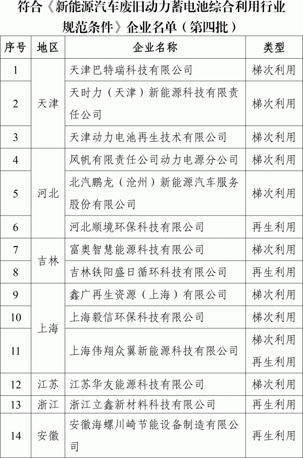 再生利用15家企業(yè),包括河北順境環(huán)??萍?、吉林鐵陽(yáng)盛日循環(huán)、上海偉翔眾翼新能源、安徽海螺川崎節(jié)能、南都華鉑新材、贛州騰遠(yuǎn)鈷業(yè)、河南科隆電源、駱駝集團(tuán)資源循環(huán)襄陽(yáng)、湖南天泰天潤(rùn)新能源等。