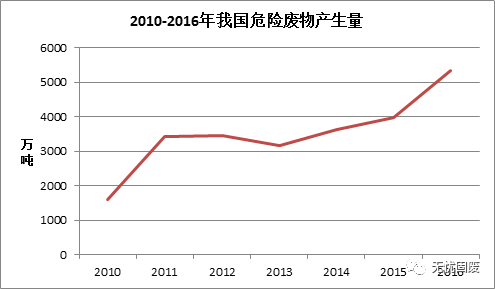 ? ? 工業行業是我國危險廢物的主要來源,根據2017中國統計年鑒顯示,2016年全國工業危險廢物產生量為5347.3萬噸,同比增長34.49%。