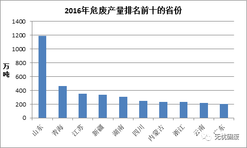 ? ? 其中山東危廢產生量最多,高達1188.28萬噸,其次是青海,產生量為462.05萬噸,江蘇危廢產生量為350.98萬噸,排名第三。