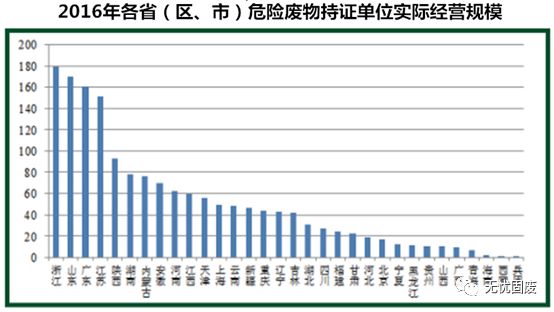 ? ? 截至2016年,全國危險廢物經營持證單位共2195家,核準經營規模達到6471萬噸,平均每家約2.9萬噸。但實際經營規模為1629萬噸,平均每家不足0.75萬噸。實際經營規模排在前三位的分別是浙江、山東和廣東。