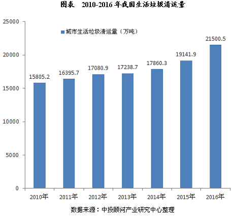 ? ? 中投顧問發布的《2018-2022年中國生活垃圾處理行業深度調研及投資前景預測報告》數據顯示:2016全國生活垃圾清運量約為21500.5萬噸。