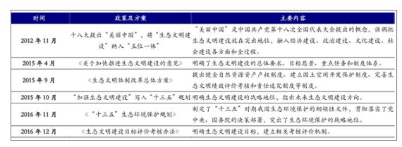? ? 隨著政府大力推行生態文明建設,生態文明頂層設計逐步完善,生態環保法制建設不斷健全。2015年4月,中共中央、國務院印發《關于加快推進生態文明建設的意見》,明確了生態文明建設的總體要求、目標愿景、重點任務和制度體系。2015年9月,《生態文明體制改革總體方案》出臺,提出健全自然資源資產產權制度、建立國土空間開發保護制度、完善生態文明績效評價考核和責任追究制度等制度。近兩年連續出臺的《新環境保護法》、《大氣污染防治行動計劃》、《水污染防治行動計劃》和《土壤污染防治行動計劃》將生態文明建設不斷由概念向具體操作領域深入落實。