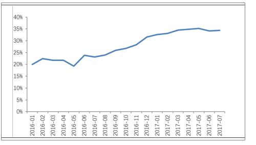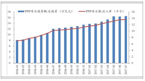 ? ? 根據全國PPP項目庫統計數據,截至2017年7月末,全國入庫項目投資額高達16.54萬億元,同比大幅增長37.49%,共計13599個;項目落地率34.40%,比上月提升0.2個百分點。