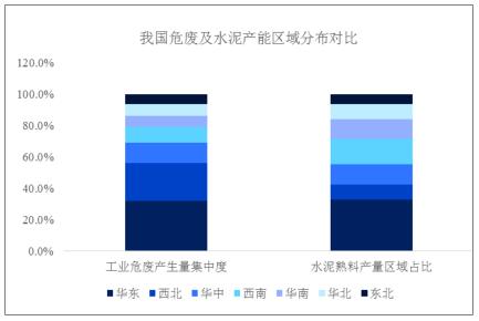 ? ? 區(qū)域分布與危廢產(chǎn)區(qū)高度匹配:水泥在是傳統(tǒng)意義上的“短腿”產(chǎn)品,業(yè)內(nèi)普遍認為其經(jīng)濟銷售半徑為公路<300公里、鐵路<500公里。因此水泥產(chǎn)能的密度與當?shù)亟?jīng)濟發(fā)展水平和基建需求直接相關(guān)。同時,危廢來自工業(yè)生產(chǎn)過程,同樣與經(jīng)濟發(fā)展水平相關(guān)。如下圖所示,水泥產(chǎn)能分布與危廢產(chǎn)量分布情況區(qū)域匹配度整體較高。因此,水泥窯協(xié)同處置工藝的區(qū)域適用性較強,適于在全國范圍內(nèi)推廣,作為普適的協(xié)同處置技術(shù),填補全國各地傳統(tǒng)危廢產(chǎn)能供需缺口。