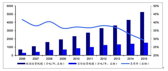 ? ? 根據《2016年全國大中城市固體廢棄物污染環境防治年報》截止2015年底,全國各省(區、市)頒發的危險廢物(含醫療廢物)經營許可證2034份,全國危廢廢物經營單位核準經營規模達到5263萬噸/年,從實際利用處置情況來看(持有危廢經營許可證的單位收集、利用、貯存及處置危險廢物的實際數量,不包括單位自行利用處置的量),2015年危險廢物實際經營規模為1536萬噸,為核準利用規模的29.18%。危廢許可證處理資質和市場需求的錯配導致資質的整體負荷率低下。