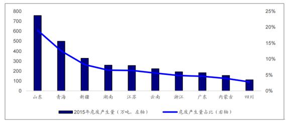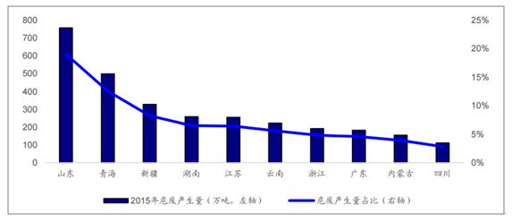 ? ? 危廢跨省運輸需要填寫危險廢物轉移聯單,經過相關部門審批,流程較為復雜,減弱了危廢處理企業之間的同業競爭,當地規模較大的企業有明顯的地域優勢,但同時也不利于危廢企業的做大做強。根據環保部發布的數據,工業危廢產生量排名前十的省(直轄市、自治區)分別是山東、青海、新疆、湖南、江蘇、云南、浙江、廣東、內蒙古、四川,合計占比達74.5%。東江環保作為行業的龍頭企業,按照已獲得的危廢處理資質計算,市占率也僅在3%左右。