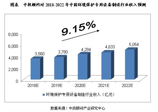 ? ? 綜合以上因素,我們預計,2018年我國環境保護專用設備制造行業收入將達到3,560億元,未來五年(2018-2022)年均復合增長率約為9.15%,2022年將達到5,054億元。