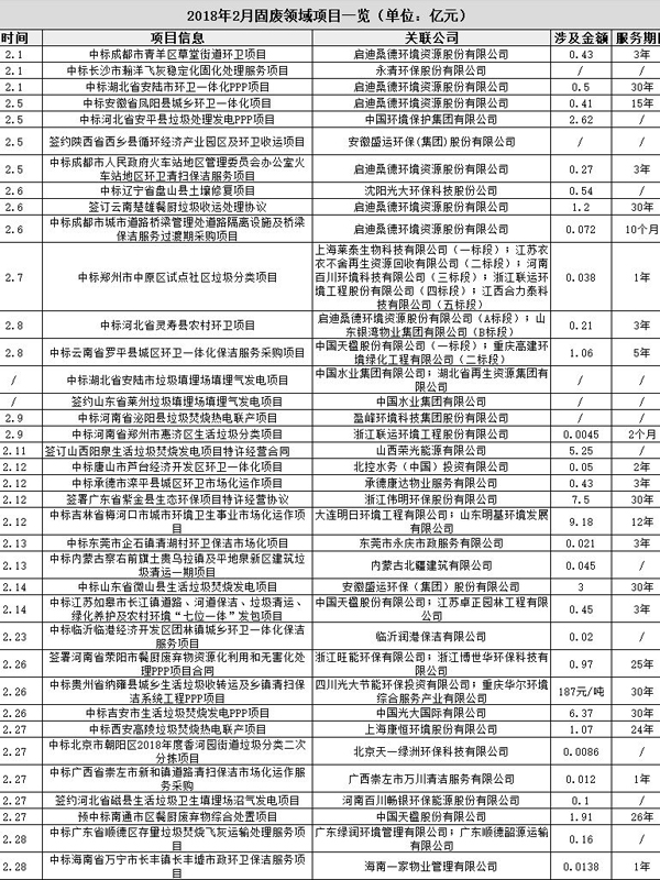 ? ? 據(jù)中國(guó)固廢網(wǎng)不完全統(tǒng)計(jì),2018年1月固廢領(lǐng)域落地的項(xiàng)目高達(dá)55個(gè),涉及總金額逾120億元(詳情請(qǐng)點(diǎn)擊:1月固廢市場(chǎng)盤(pán)點(diǎn):55個(gè)項(xiàng)目落定,涉及金額逾120億元)。2018年2月,即使處在春節(jié)放假期間,固廢領(lǐng)域落地的項(xiàng)目也足有37個(gè),涉及金額超過(guò)43.91億元。其中包括垃圾分類(lèi)項(xiàng)目3個(gè)、垃圾焚燒發(fā)電項(xiàng)目7個(gè)、環(huán)衛(wèi)項(xiàng)目15個(gè)、土壤修復(fù)項(xiàng)目1個(gè)、餐廚處理項(xiàng)目3個(gè)、垃圾清運(yùn)項(xiàng)目3個(gè)、飛灰處理項(xiàng)目2個(gè)以及垃圾填埋場(chǎng)項(xiàng)目3個(gè)。另外,統(tǒng)計(jì)內(nèi),本月沒(méi)有釋放危廢處理項(xiàng)目。
